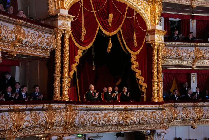 Ruský prezident Vladimir Putin (uprostred), kazašský prezident Kasym-Žomart Tokajev (uprostred vľavo), dirigent a generálny riaditeľ Veľkého divadla Valerij Gergijev (druhý zľava) a ruská ministerka kultúry Olga Ľubimovová (uprostred vpravo) počas koncertu majstrov umenia Kazachstanu vo Veľkom divadle v Moskve. Rusko, 12. novembra 2025. Foto: AP Photo/Alexander Zemlianichenko, Pool