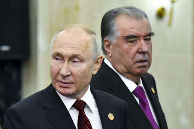 Ruský prezident Vladimir Putin (vľavo) a prezident Tadžikistanu Emómalí-ji Rahmón počas Spoločenstva nezávislých štátov (SNŠ) v kirgizskom Biškeku. Foto: SITA/AP.