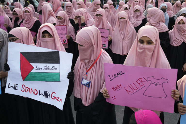 Pakistanské ženy a prívrženkyne strany Jamaat-e-Islami na zhromaždení proti izraelským náletom na Gazu. Zároveň vyjadrujú podporu Palestíne. Foto: SITA/AP.