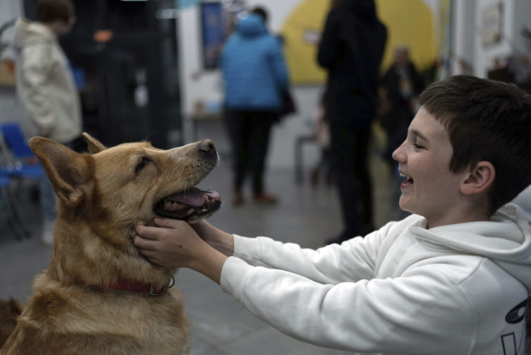 Kyrylo Tereschuk sa hrá so psom Nika, ktorý je špeciálne vycvičený na canisterapiu. Kurzy vznikli pre deti padlých a slúžiacich ukrajinských vojakov, nakoľko je canisterapia špeciálna metóda využívajúca pozitívne pôsobenie psa na človeka. Foto: SITA/AP.