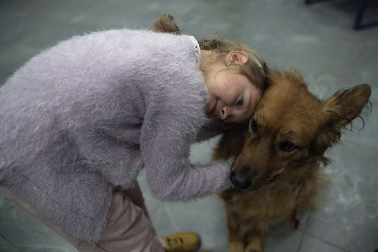 Deväťročná Varvara Zagumenna so sučkou Chelsea, ktorá je špeciálne vycvičená na canisterapiu. Kurzy vznikli pre deti padlých a slúžiacich ukrajinských vojakov, nakoľko je canisterapia špeciálna metóda využívajúca pozitívne pôsobenie psa na človeka. Foto: SITA/AP.