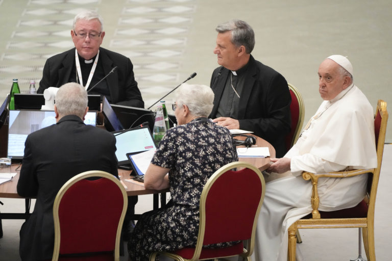 Pápež František počas zasadnutia 16. generálneho zhromaždenia Biskupskej synody v aule Pavla VI. vo Vatikáne. Foto: SITA/AP.