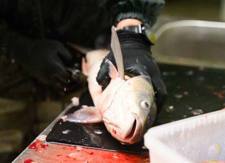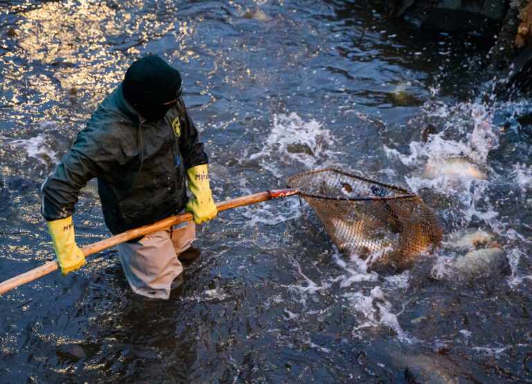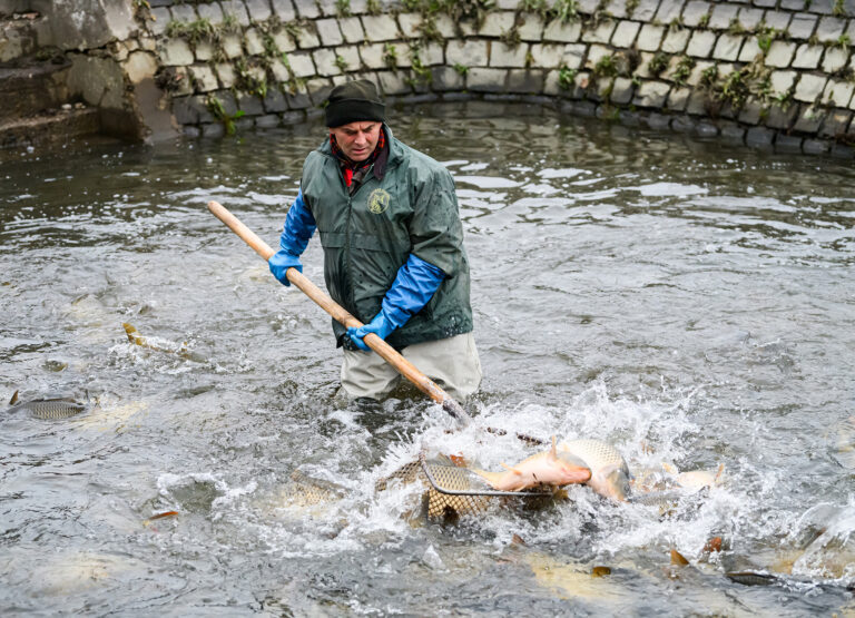 Výlov a triedenie živých rýb a predaj čerstvých rýb z levických rybníkov. Levice, 14. december 2024. Foto: SITA/Martin Havran