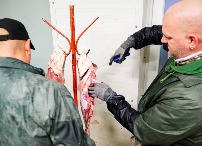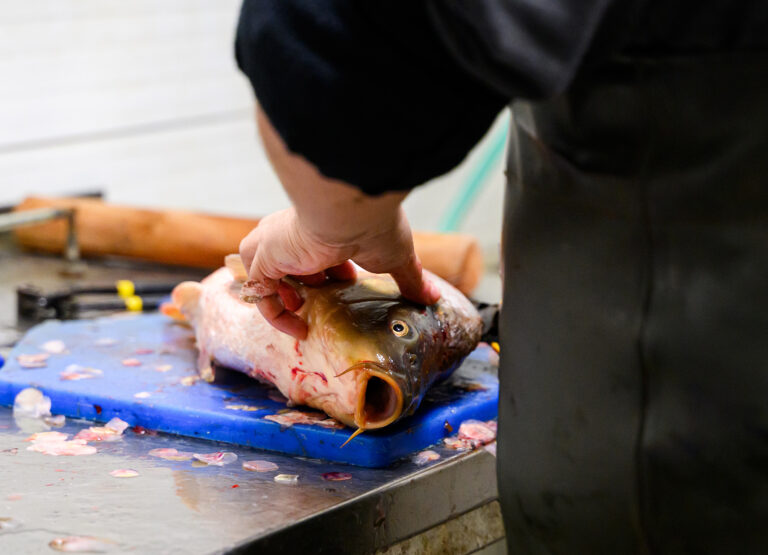 Spracovanie živých rýb pre zákazníkov počas predaja čerstvých rýb z levických rybníkov. Levice, 14. december 2024. Foto: SITA/Martin Havran