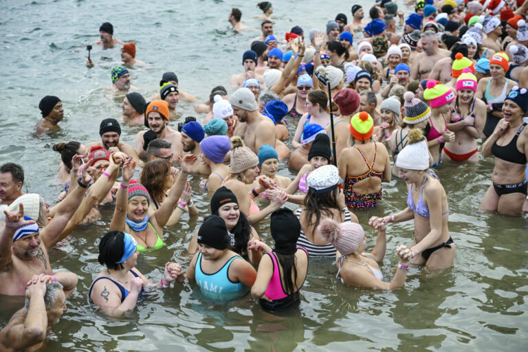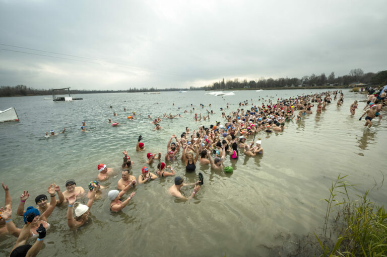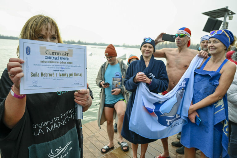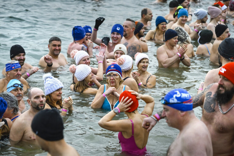 Atmosféra počas vytvorenia nového slovenského rekordu v počte 604 otužilcov v ľadovej vode na Zlatých Pieskoch v Bratislave. Bratislava. 14. december 2024. Foto: SITA/Milan Illík
