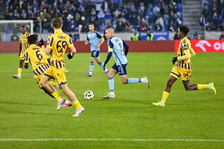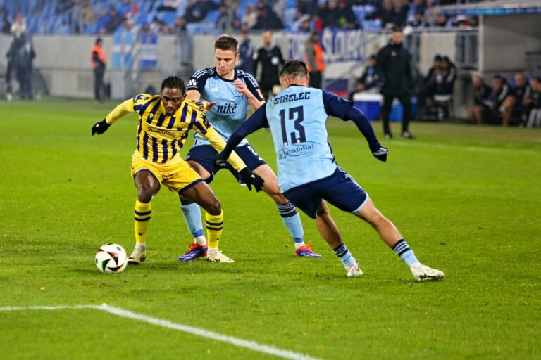 Zľava: Yohan Anzouana z FC DAC 1904 Dunajská Streda, Dávid Strelec a Siemen Voet, obaja ŠK Slovan Bratislava počas futbalového zápasu 18. kola Niké ligy 2024/2025 medzi ŠK Slovan Bratislava - FC DAC 1904 Dunajská Streda. Bratislava, 14. december 2024. Foto: SITA/Tomáš Susko