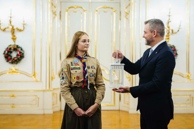 Prezident SR Peter Pellegrini (vpravo) počas odovzdania Betlehemského svetla v Prezidentskom paláci. Bratislava, 14. december 2024. Foto: SITA/Kancelária prezidenta