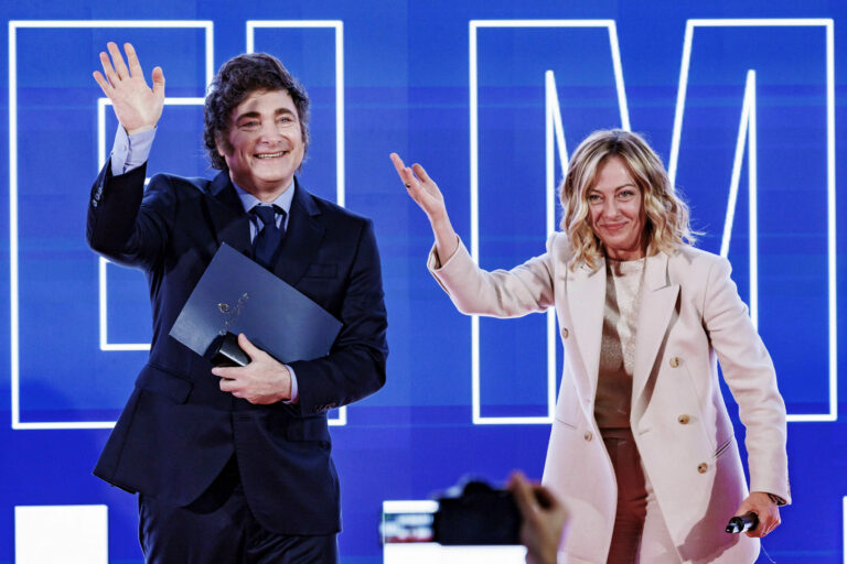 Argentínsky prezident Javier Milei a premiérka Giorgia Meloniová na podujatí Atreju 2024. Foto: Roberto Monaldo/LaPresse via AP