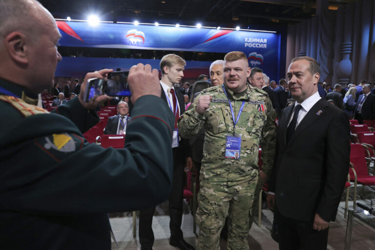Podpredseda Ruskej bezpečnostnej rady a predseda strany Jednotné Rusko Dmitrij Medvedev (vpravo) na fotografii s účastníkom zjazdu strany Jednotné Rusko v Moskve. Foto: Ekaterina Shtukina, Sputnik, Kremlin Pool Photo via AP