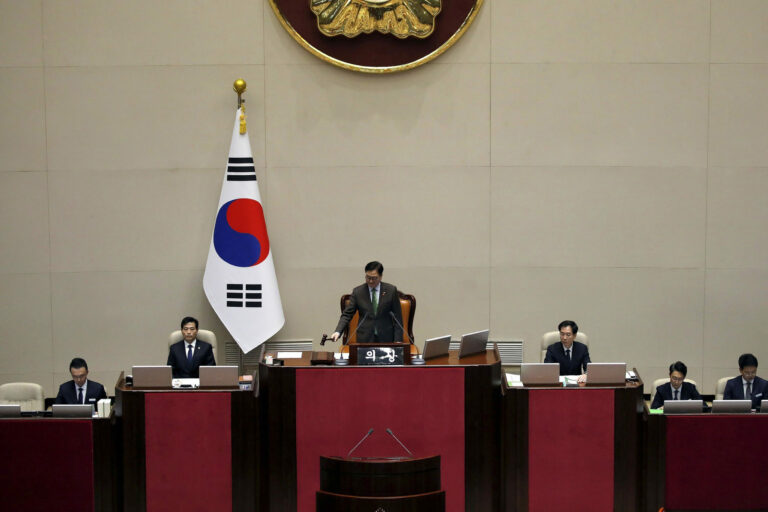 Predseda juhokórejského Národného zhromaždenia Woo Won-shik (uprostred) otvára plenárne zasadnutie, na ktorom sa bude hlasovať o obžalobe prezidenta Yoon Suk Yeola. Foto: Woohae Cho/Pool Photo via AP