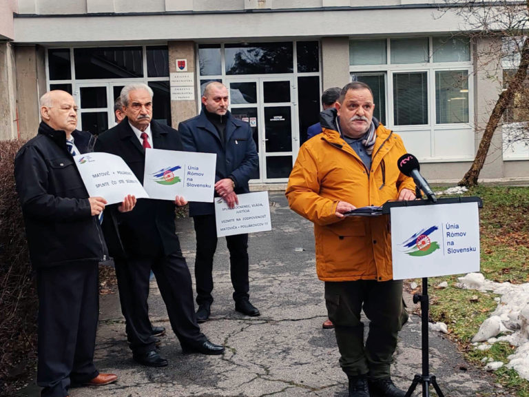 Predseda Únie Rómov Slovenska František Tanko počas tlačovej konferencie k aktuálnej situácii ohrozených rómskych komunít, politickej korupcii, dôsledkom a riešeniam, pred budovou Krajskej prokuratúry v Prešove. Prešov, 14. december 2023. Foto: SITA/Únia Rómov na Slovensku.