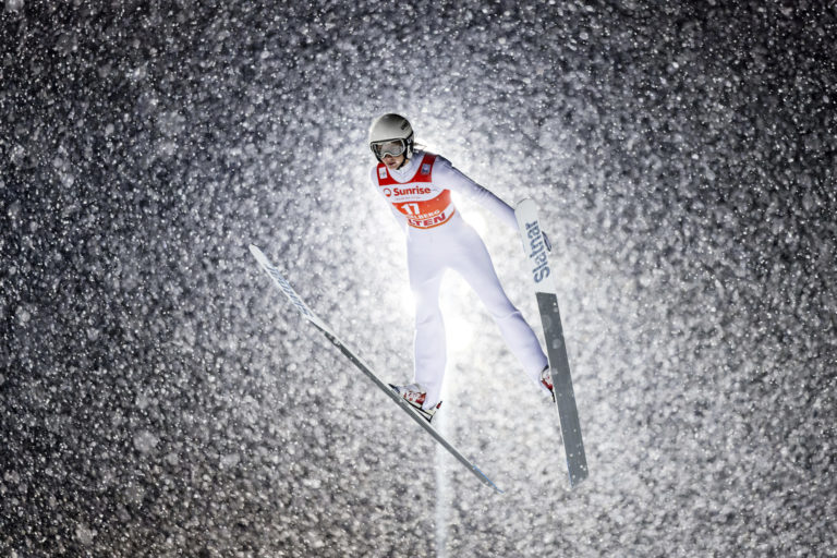 Rumunská reprezentantka Daniela Haralambie súťaží počas kvalifikácie pretekov Svetového pohára v skokoch na lyžiach vo švajčiarskom Engelbergu. Foto: Philipp Schmidli/Keystone via AP