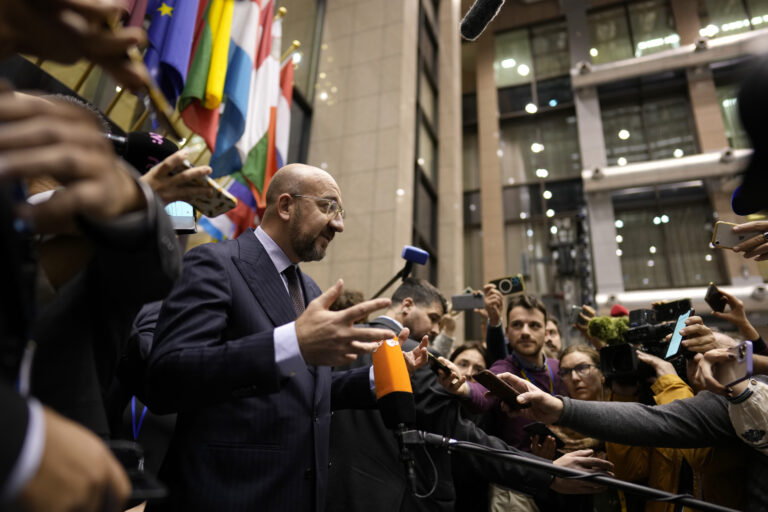 Predseda Európskej rady Charles Michel hovorí médiám informáciu, že Európska únia sa rozhodla otvoriť prístupové rokovania s Ukrajinou a Moldavskom. Foto: SITA/AP.