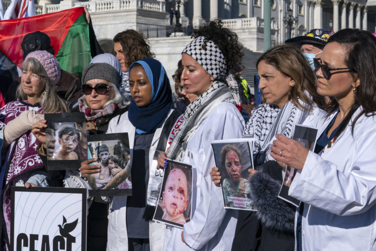 ľudia pred Kapitolom vo Washingtone vyzývajú na prímerie v Pásme Gaza. Foto: SITA/AP.