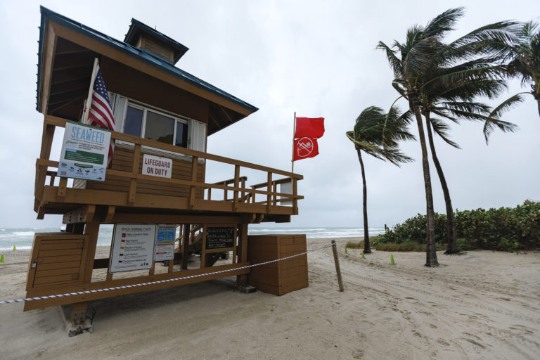 Pohľad na plavčíkovu vežu vedľa rybárskeho móla v Newporte, ktorá upozorňuje na dvojité červené výstražné vlajky na Floride. Očakáva sa silný nárazový vietor, dážď a tiež zaplavené ulice. Foto: David Santiago/Miami Herald via AP.