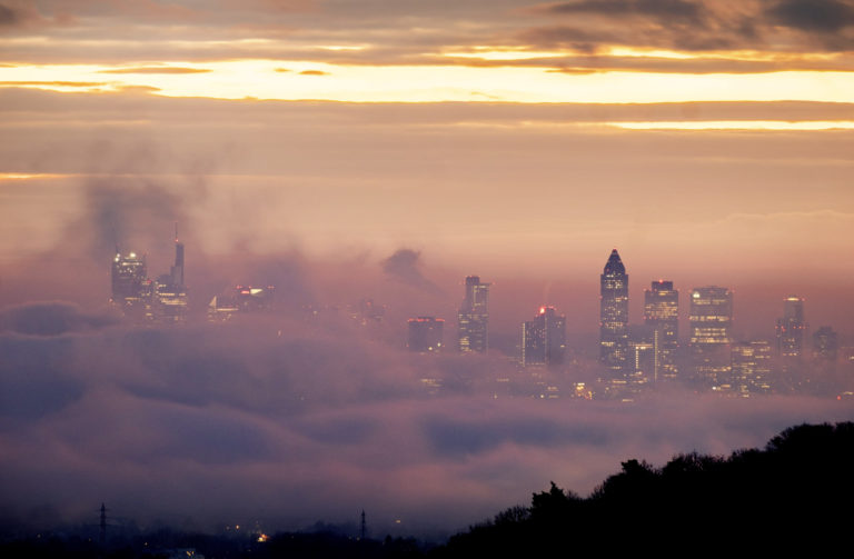 Hmla pri budovách bankovej štvrti vo Frankfurte nad Mohanom. Foto: SITA/AP.