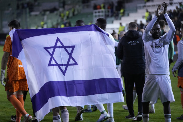 Hráči Maccabi Haifa oslavujú s vlajkou Izraela víťazstvo vo futbalovom zápase skupiny F v Európskej lige, v ktorom vyhrali 2:1 nad Apostolos Nikolaidis v Aténach. Foto: SITA/AP.