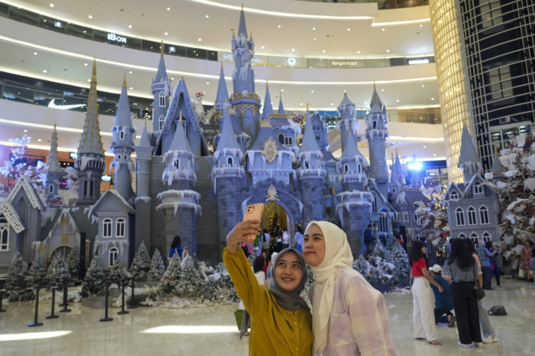 Moslimské ženy si robia selfie pred zimným kráľovstvom v nákupnom centre Senayan City v Jakarte. Foto: SITA/AP.