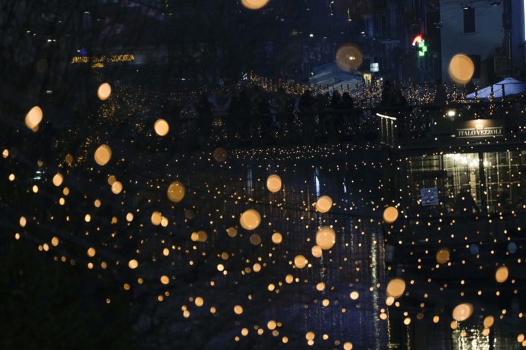 Ľudia kráčajú po vyzdobenom moste, ktorého vianočné svetielka osvetľujú milánsku štvrť Darsena dei Navigli. Foto: SITA/AP.