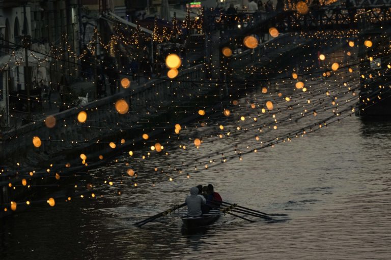 Veslári pádlujú popod vianočné svetlá, ktoré osvetľujú kanál Naviglio Grande v Miláne. Foto: SITA/AP.