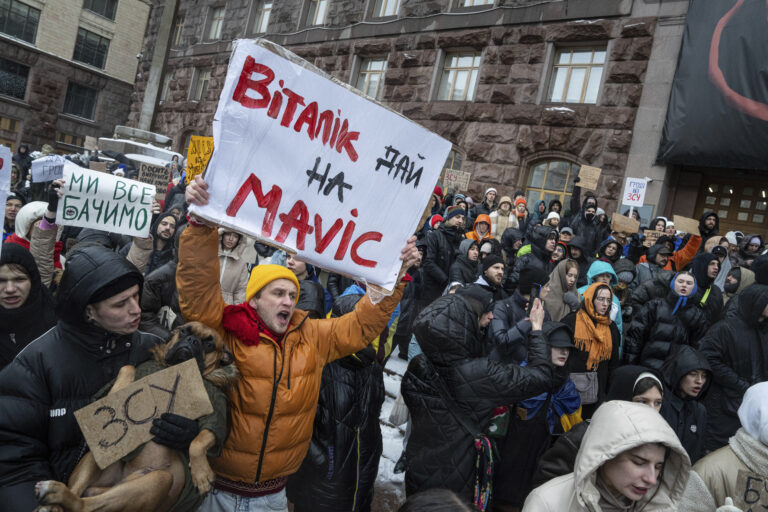 Aktivista drží nápis „Vitalij Kličko dáva peniaze pre Moviča (dron)“ počas protestu pred mestským zastupiteľstvom v Kyjeve. Množstvo ľudí prišlo na protest pre podporu Bezpečnostných a obranných síl Ukrajiny z rozpočtu Kyjeva, ktorý je plnený peniazmi na úkor daňových poplatníkov, dotácií a iných príjmov. Foto: SITA/AP.
