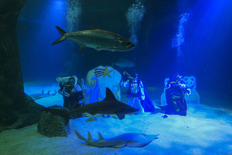 Žralok a iné ryby plávajú okolo potápačov, ktorí sú oblečení ako traja mudrci v Betleheme na dne akvária v madridskej ZOO. Foto: SITA/AP.