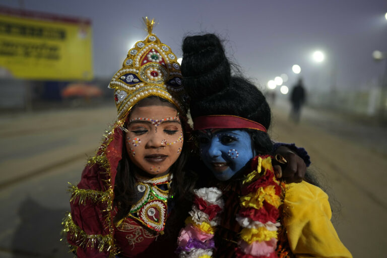 Deti oblečené ako hinduistický boh Šiva a bohyňa Parvati kráčajú blízko Sangamu, sútoku troch riek - Gangy, Jamuny a mýtickej Saraswati, počas festivalu Makar Sankranti počas tradičného Magh Mela v Prayagraji, v severoindickom štáte Uttar Pradesh, India. Foto: SITA/AP.