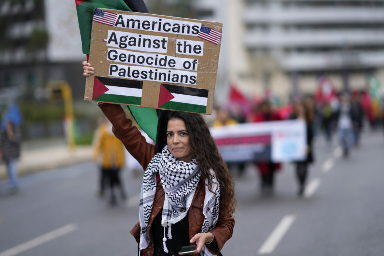 Tisíce ľudí demonštrovali v Lisabone v podpore palestínskeho ľudu a požadovali zastavenie paľby v pásme Gazy. Foto: SITA/AP.