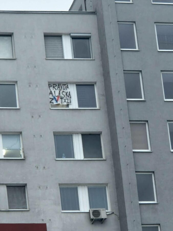 Obyvatelia bratislavskej Petržalky vyvesili do okna odkaz vláde SR počas výjazdového rokovania 123. schôdze vlády SR v Zrkadlovom háji. Bratislava, 14. január 2026. Foto: SITA/InkluCiTy