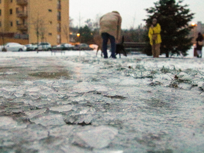 Ľudia venčia psov v zľadovatenom parku v bratislavskej Dúbravke počas mrazivého počasia. Bratislava, 13. január 2026. Foto: SITA/Andrea Mezeiová