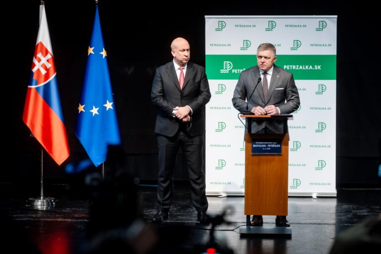 Sprava: Predseda vlády SR Robert Fico a minister dopravy SR Jozef Ráž počas tlačovej konferencie v rámci výjazdového rokovania 123. schôdze vlády SR v Zrkadlovom háji v Bratislave. Bratislava, 14. január 2026. Foto: SITA/Úrad vlády SR