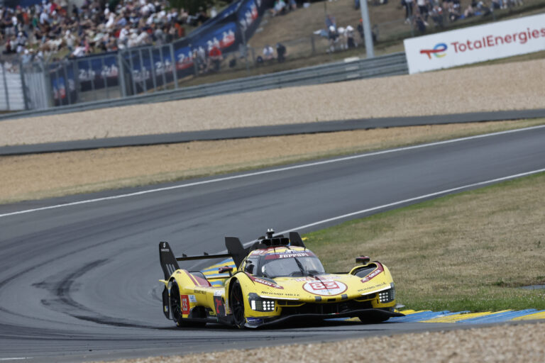 Automobil AF Corse Ferrari499P s Robertom Kubicom z Poľska, Yifei Ye z Číny a Philom Hansonom z Veľkej Británie preteká počas 24-hodinových vytrvalostných automobilových pretekov Le Mans. Francúzskom 14. júna 2025. Foto: (AP Photo/Jeremias Gonzalez)