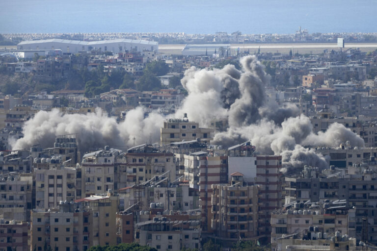 Smoke rises between buildings hit in an Israeli airstrike in Dahiyeh, in the southern suburb of Beirut, Lebanon, Thursday, Nov. 14, 2024. (AP Photo/Hussein Malla)