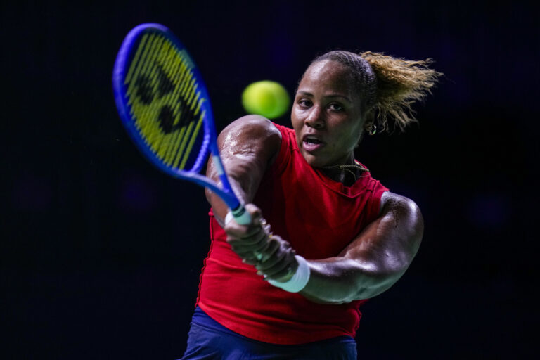 Taylor Townsendová zo Spojených štátov amerických vracia loptu proti Slovenke Renate Jamrichovej počas finále Billie Jean King Cup v športovej hale Martina Carpenu v Malage na juhu Španielska vo štvrtok 14. novembra 2024. Foto: SITA/AP