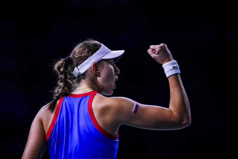 Slovenská reprezentantka Renata Jamrichová oslavuje vo štvrtok 14. novembra 2024 bod proti Američanke Taylor Townsendovej počas finále Billie Jean King Cup v športovej hale Martina Carpenu v juhošpanielskej Malage. Foto: SITA/AP