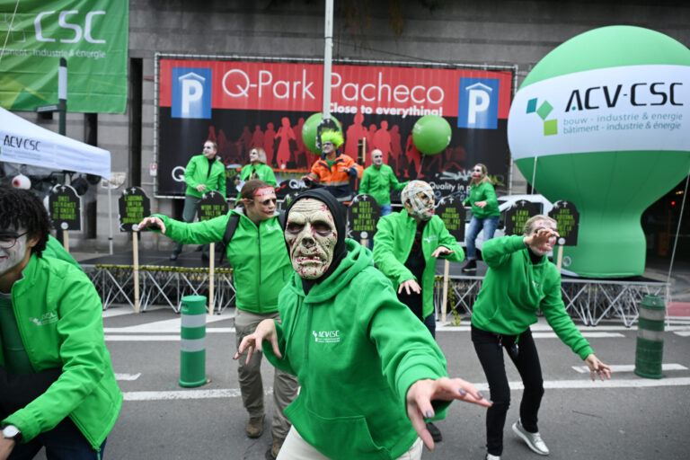 Ľudia oblečení ako zombie pochodujú počas demonštrácie a generálneho štrajku v Bruseli. Belgicko, 14. októbra 2025. Foto: (AP Photo/Harry Nakos)