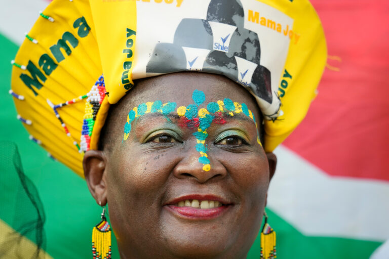 Fanúšička Južnej Afriky čaká na začiatok kvalifikačného zápasu skupiny C futbalových majstrovstiev sveta 2026 medzi Južnou Afrikou a Rwandou na štadióne Mbombela v Nelspruite. Južná Afrika, 14. októbra 2025. Foto: (AP Photo/Themba Hadebe)