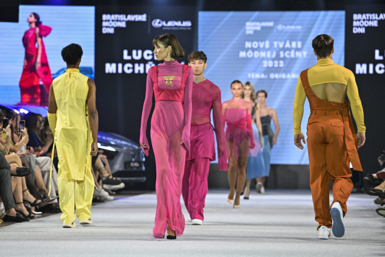 Kolekcia módnej návrhárky Lucie Michnovej počas módnej prehliadky Bratislavské módne dni (BMD) LEXUS 2023 - Finále projektu Nové tváre módnej scény v Rafinery Gallery. Foto: SITA/Milan Illík.
