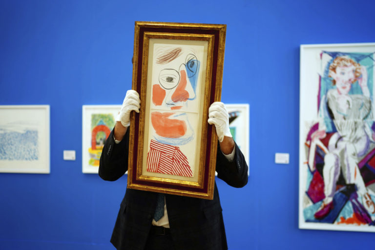 Autoportrét Davida Hockneyho z roku 1986 počas výstavy jeho významných diel v aukčnom dome Phillips. Foto: Victoria Jones/PA via AP.