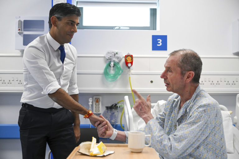 Britský premiér Rishi Sunak sa stretol s pacientami Nemocnice Severného Devona v Barnstaple. Foto: Finbarr Webster/PA via AP.