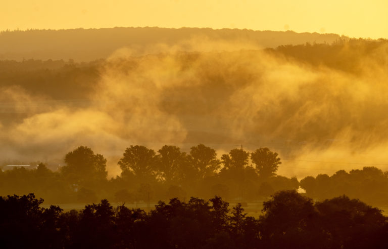 Štvrtková ranná hmla nad lesmi v Wehrheime blízko Frankfurtu. Foto: SITA/AP.