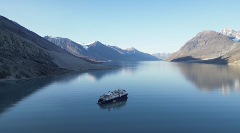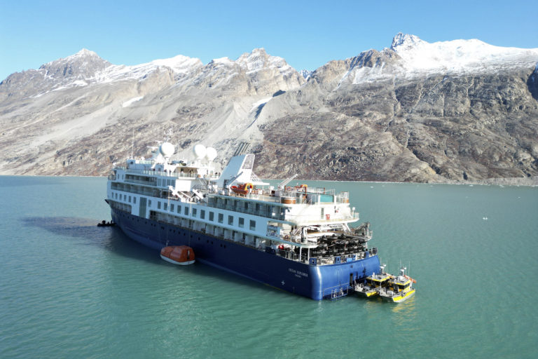 Pohľad na výletnú loď Ocean Explorer, ktorá uviazla na severozápade Grónska, na jej palubu bolo 206 cestujúcich. Foto: SIRIUS/Joint Arctic Command via AP.