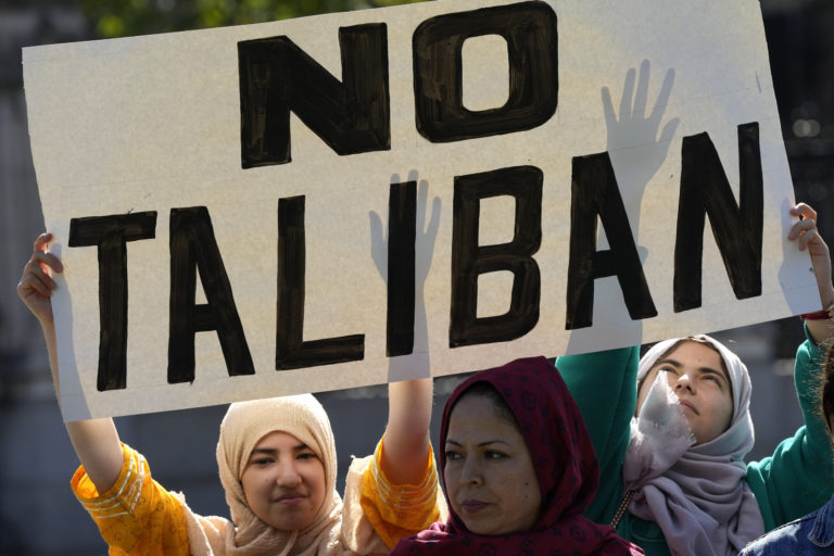 Ľudia protestujú v Londýne proti Talibanu pri príležitosti výročia prebratia moci v Afganistane. Foto: SITA/AP.