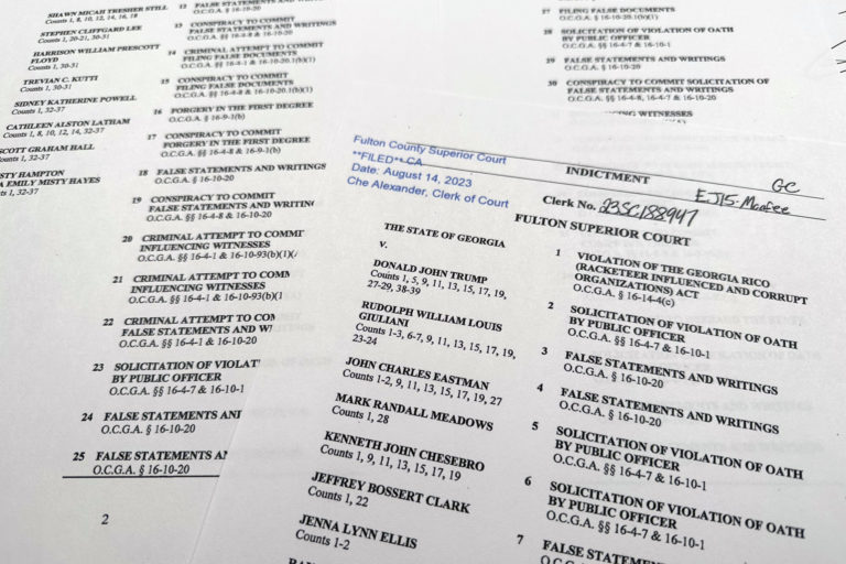 Bývalého amerického prezidenta Donalda Trumpa a 18 jeho spojencov v Georgii obvinili z plánovania nezákonného zvrátenia jeho volebnej prehry v štáte v roku 2020. Je to už štvrté trestné konanie proti nemu a druhé v tomto mesiaci, ktoré uvádza, že sa pokúsil zvrátiť výsledky volieb. Foto: SITA/AP.