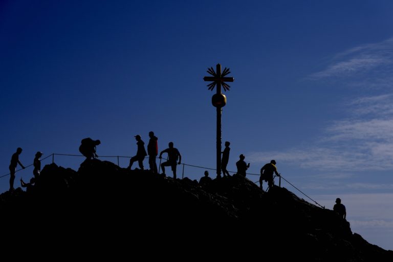 Ľudia pri kríži na Zugspitze, najvyššom vrchu Nemecka, ktorý sa nachádza v Bavorsku neďaleko Garmisch-Partenkirchenu. Foto: SITA/AP.