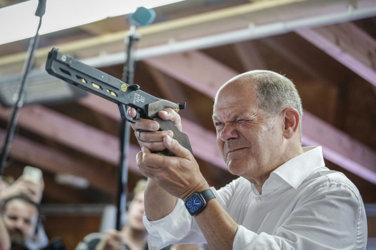 Nemecký kancelár Olaf Scholz strieľa laserovou pištoľou v Olympijskom centre v v Postupime v rámci letnej cesty po svojom volebnom obvode. Foto: Kay Nietfeld/dpa via AP.