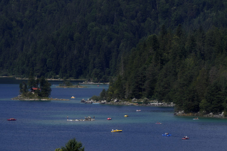 Ľudia si užívajú slnečný deň pri jazere Eibsee v Grainau, ktoré sa nachádza pod najvyšším vrchom Nemecka Zugspitze. Foto: SITA/AP.