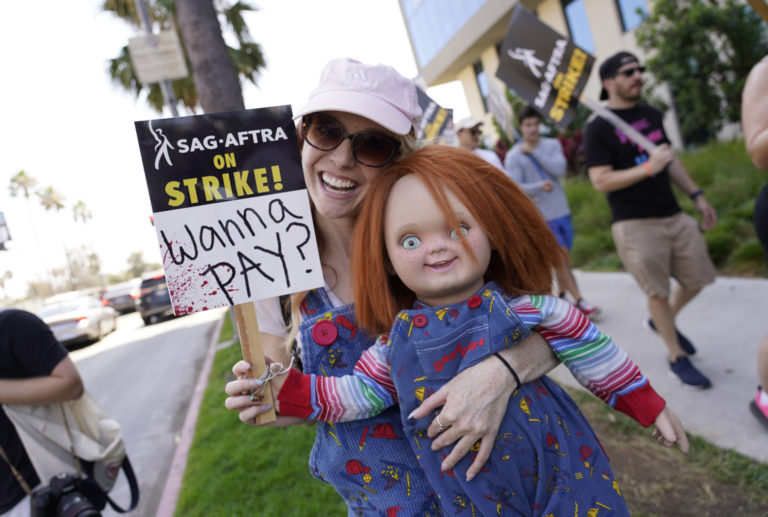 Kyra Gardner s bábikou Chucky počas štrajku hercov a scenáristov v Hollywoode pred filmovými štúdiami Netlfix. Foto: SITA/AP.
