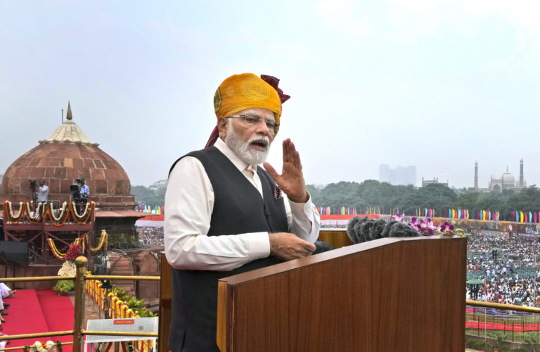 Indický premiér Naréndra Dámodardás Módí počas príhovoru v Nai Dillí pri príležitosti Dňa nezávislosti v krajine. Foto: SITA/AP.