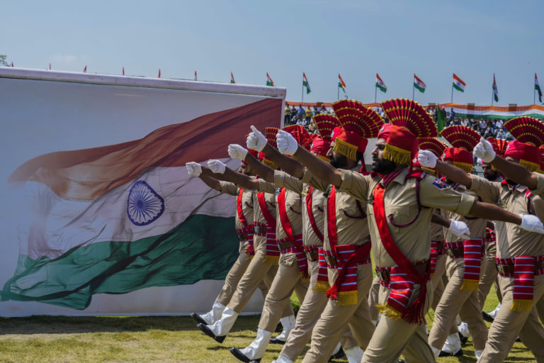 Policajti počas osláv Dňa nezávislosti v Kalkate. India oslávila 76 rokov nezávislosti od britskej nadvlády. Foto: SITA/AP.
